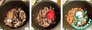 Затем добавить овощи, все приправы, томатную пасту, посолить и поперчить, хорошо перемешать и жарить 3-5мин.
