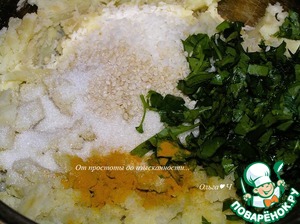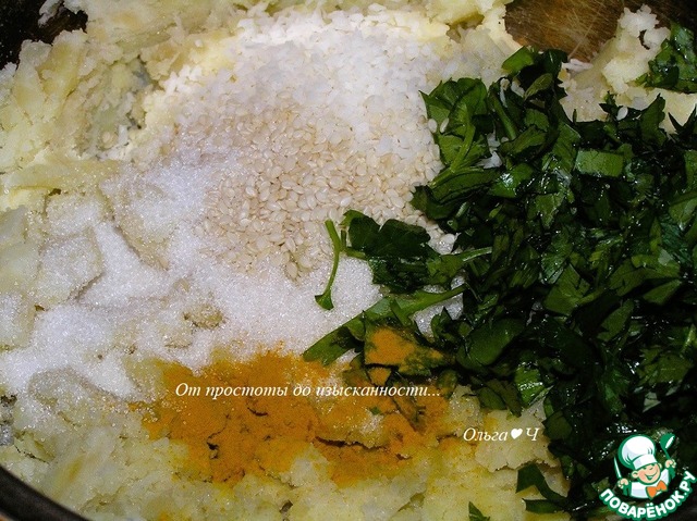 Добавьте кокосовую стружку, кунжут, сахар, зелень, куркуму, смесь гарам масала и соль.