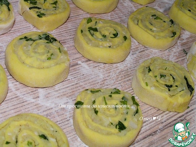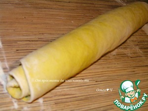 Нарежьте рулет ломтиками, шириной 1-1,5 см, выложите на присыпанную мукой поверхность.
