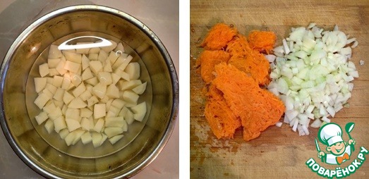 Почистить лук, морковь и картофель. Лук и картофель нарезать кубиками, морковь натереть на терке.