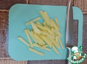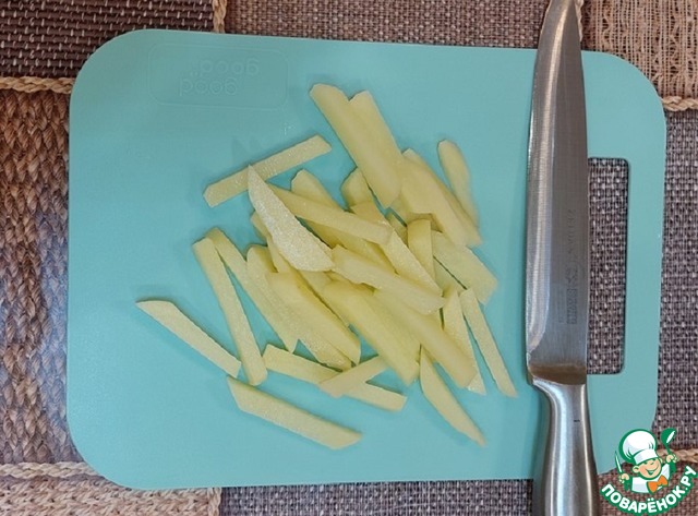 3. Нарезаем картофель брусочками. Толщина брусочка около 0,5-1 см, но не более. Все брусочки должны быть одинакового размера для того, чтобы они равномерно прожарились.