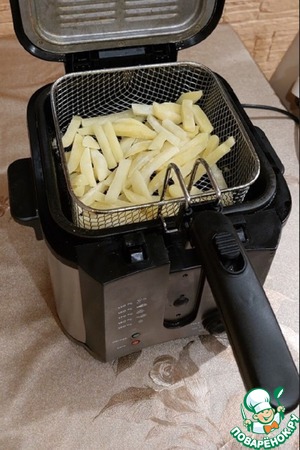 8. Второй раз выложите ломтики картофеля в форму для обжаривания. Закройте крышку фритюрницы. Время жарки картофеля составляет 5-7 минут. Во второй раз жарки у картофеля будет образовываться хрустящая корочка.