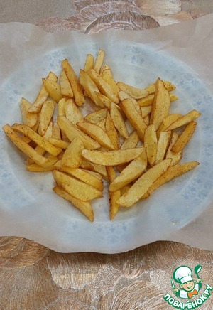 Замечание*: если вы хотите получить очень хрустящий картофель, то во второй раз ломтики нужно жарить снова 2-3 минуты. Далее второй раз выложить картофель на противень с бумажными полотенцами, дать остыть. В третий раз жарить надо 4-5 минут до образования хрустящей румяной корочки. -