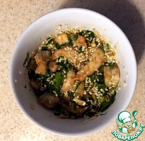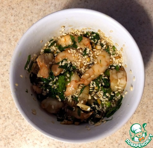 9. Замариновать креветки в соусе из кокосового масла, кунжута, соевого соуса, петрушки и чеснока в течении 30 минут или более.