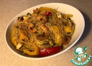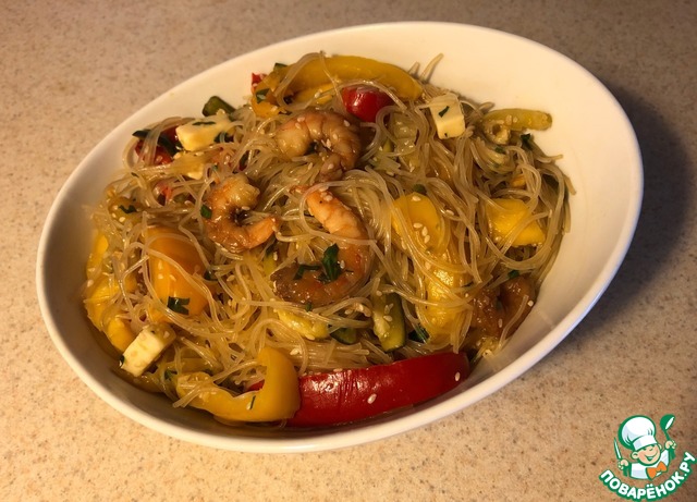 Всем любителям фунчозы рекомендую приготовить это экзотическое блюдо, где кокосовые нотки отлично гармонируют с манго и перчиком. Маринованные креветки в чесночном соусе прекрасно дополняют это блюдо.