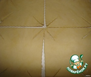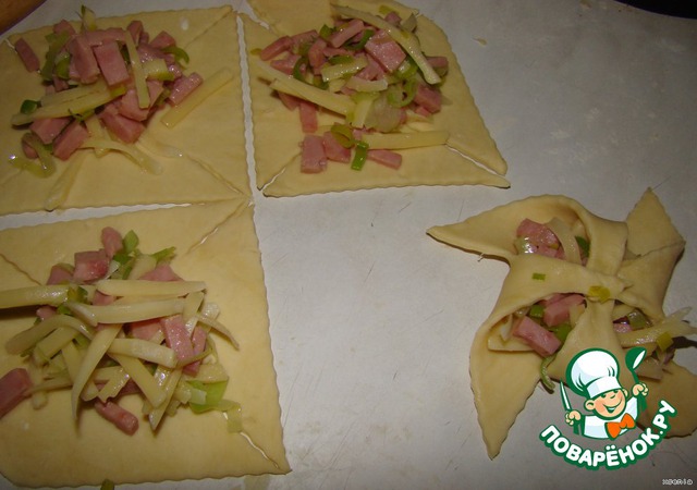 На середину выкладываем начинку... и уголки теста загибаем...