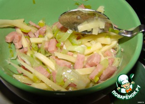 Ветчину немного обжарить с луком и смешать с сыром -