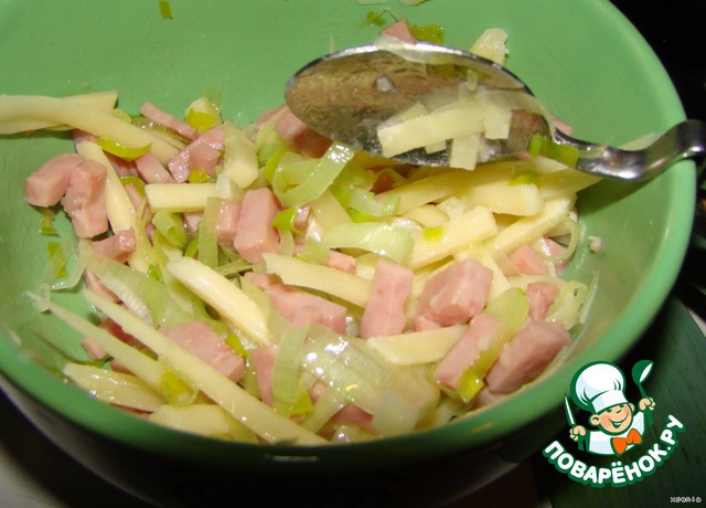 Ветчину нарезать на кусочки...