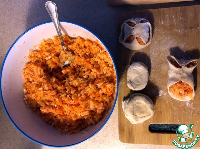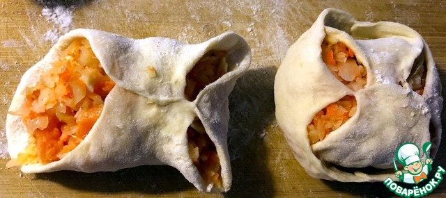 4. На лепешку теста выкладываем начинку и защипываем. Существует несколько способов "защипывания". Дело вкуса и семейных традиций. Я выбрала неполный способ "защипывания".