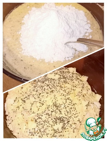 В тесто добавить муку с разрыхлителем, перемешать. И замешать ветчину и сыр - начинки мы сделали много, по ощущениям больше чем самого теста, поэтому добавляем постепенно, перемешивая каждую порцию.