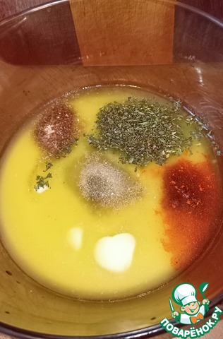 60 г масла слегка подтопить в микроволновке на малой мощности. Добавить к нему соль, сахар, паприку, сушеную зелень, псиллиум (он нужен для клейкости, которой нет в безглютеновой муке). -
