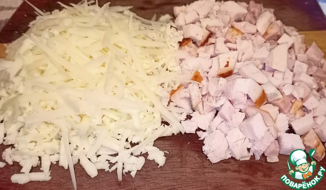 В это время можно мелко нарезать ветчину и натереть сыр.