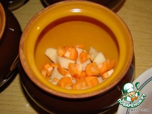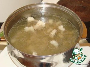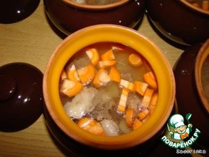 Сверху выложить мясо и залить бульоном (но не до самого верха).