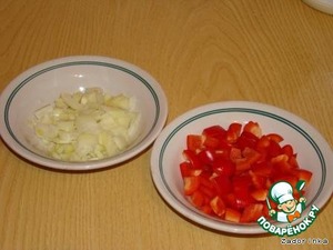 Достать горшочки из духовки, выложить в них перец, лук и посыпать зеленью.