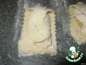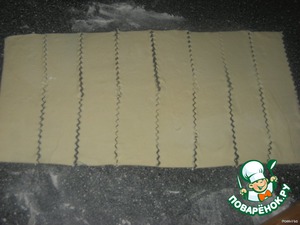 Тесто разморозить, раскатать, нарезать ножом с волнистым лезвием, полосками.