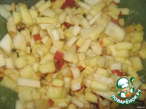 Нарезать кубиками, посыпать корицей и сахаром, перемешать. -