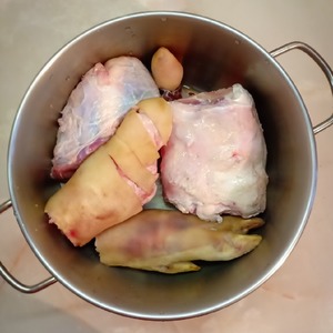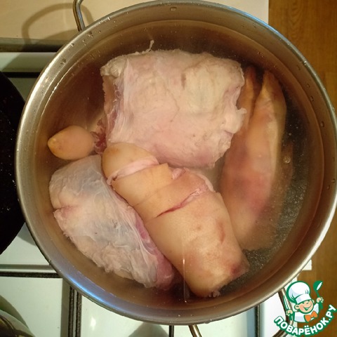Хорошенько очистить свиные и говяжьи ножки от грязи и волосинок, при необходимости опалить огнем. Промыть их под холодной водой и поскоблить ножом так, чтобы счистить верхний слой.
