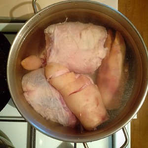 Готовое мясо положить в большую кастрюлю и залить холодной проточной водой так, чтобы она полностью покрыла его. Поставить кастрюлю на огонь.
