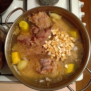 Затем в кастрюлю с мясом добавить соль, коренья, лук и морковь целиком, черный перец горошком. Варить еще 2 - 3ч. За 10мин до окончания варки добавить лавровый лист. Выключить и полностью остудить содержимое кастрюли.