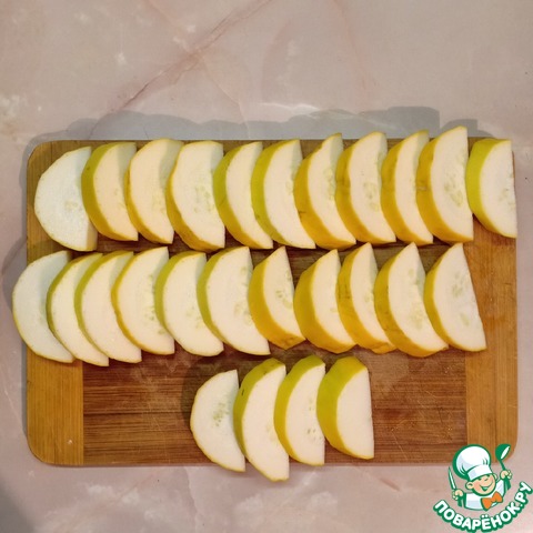 Кабачок помыть, обрезать кончики и нарезать полукружьями.