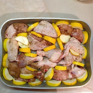 Форму для запекания смазать подсолнечным маслом, выложить в нее кусочки курицы и кабачок. Поставить форму с мясом на 30-40мин в духовку, предварительно разогретую до 190-200C, время от времени поливая курицу образовавшимся соком.