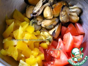 Мидии отварите в подсоленной воде, остудите. Перец и помидор нарежьте небольшими кусочками, добавьте мидии, перемешайте.