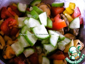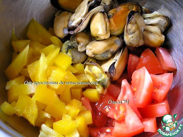 Мидии отварите в подсоленной воде, остудите. Перец и помидор нарежьте небольшими кусочками, добавьте мидии, перемешайте. |