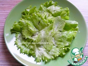 Листья салата порвите руками, разложите по тарелкам, посолите, поперчите. |