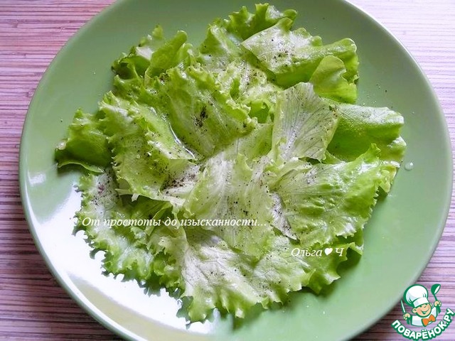 Листья салата порвите руками, разложите по тарелкам, посолите, поперчите.