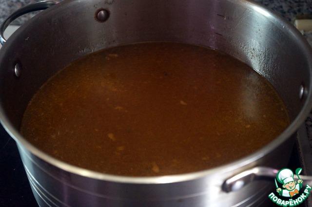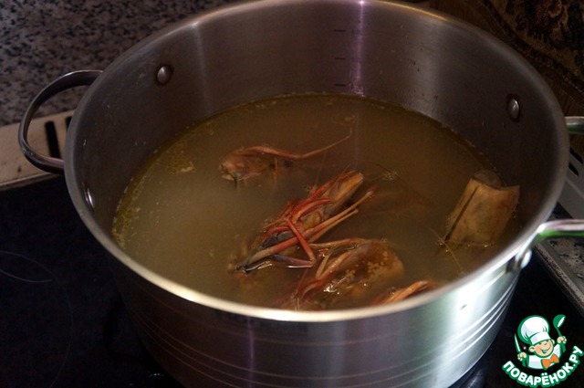 - Бульон (у меня бульон из копченой рыбы, кроме того - панцири креветок и разные отходы предыдущего производства: плавники, хвосты и пр.) — 3 л