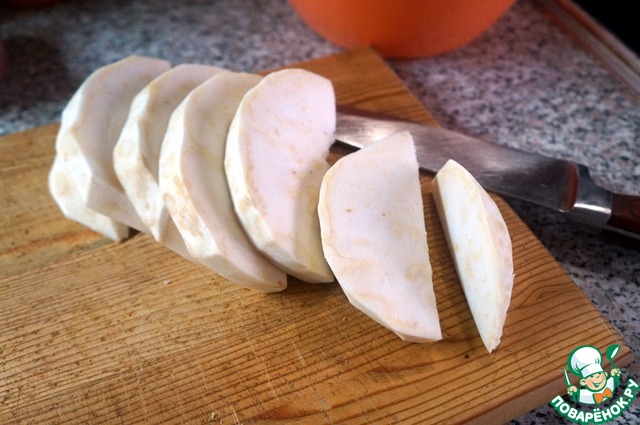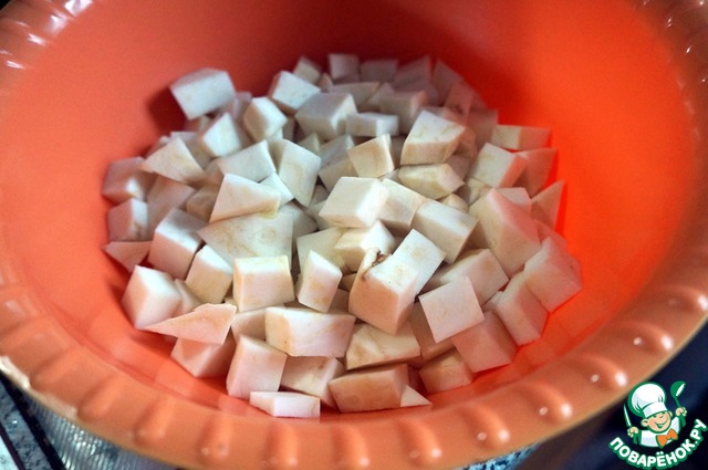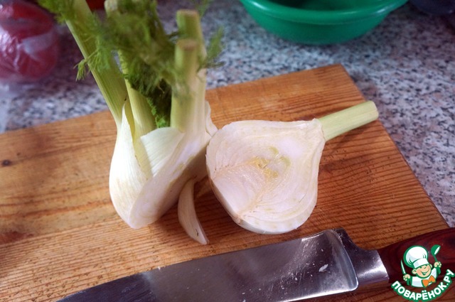 От клубня фенхеля отрезать треть – больше не понадобится. Порезать его очень мелко.