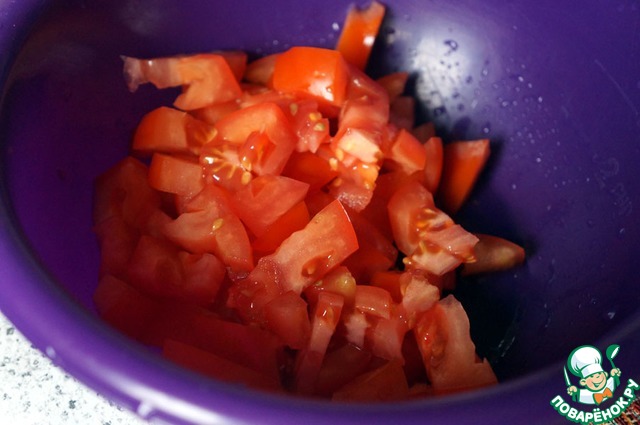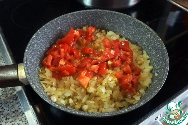 Тем временем в сковороде разогреть масло, обжарить лук, фенхель и помидор. Через пять минут после жарки добавить две-три ложки бульона, убавить огонь до самого малого, накрыть крышкой и тушить до полной мягкости овощей.
