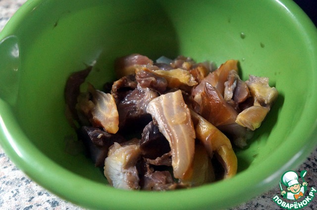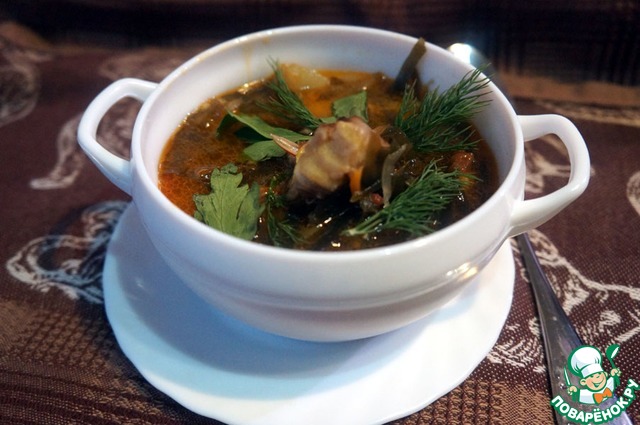 Подобную солянку, где была и свежая рыба, и копченая, я уже готовил и рецепт выкладывал. Эта же поистине эксклюзивная. Во-первых, здесь в основе – бульон из вываренной копченой головы осетра. Во-вторых, вместо квашеной или свежей капусты – морская. Ну а картошку заменяет клубень сельдерея. Копченую голову осетра мы купили в рыбном хозяйстве. Покорила показным благородством. Мяса в ней оказалось не так много, зато черепок каков! Я его выварил. Из вываренного черепка еще отделилось некоторое количество мяса – как раз для моей задумки.