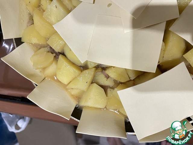 Не мешая, сверху выкладываем порезанную на 4-6 частей картошку. Заливаем водой как на фото и накрываем крышкой на 10-15 минут.