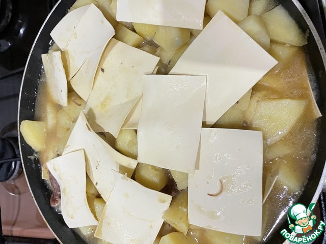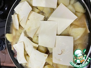 Не мешая, сбоку пытаемся под картошку засунуть лапшу и выкладываем ее сверху. Чуть добавляем воды и под крышкой на медленном огне тушим еще минут 10.