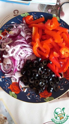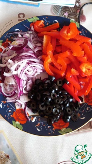Лук режем полукольцами, сладкий перец полосками, маслины колечками. Кто умеет лучше резать очень тоненько, ну у меня уж как вышло!