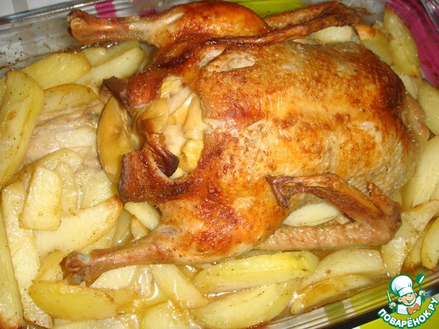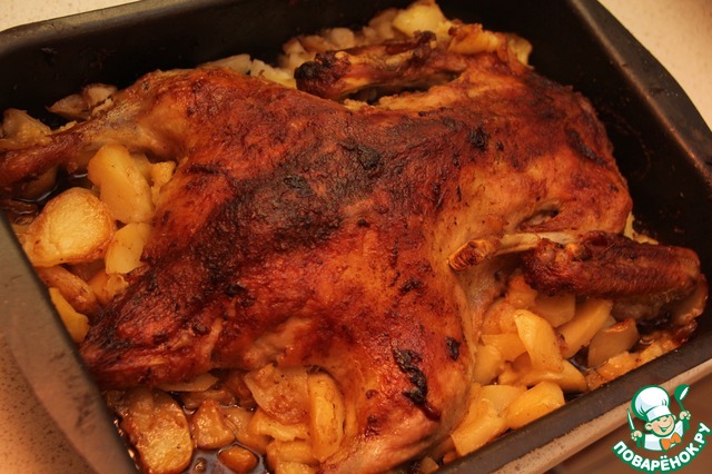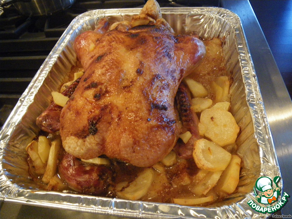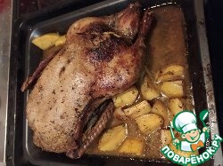 За время приготовления (у меня оно заняло 2 часа, всё от уточки зависит) несколько раз нужно полить утку соком, а картофель перемешать.
