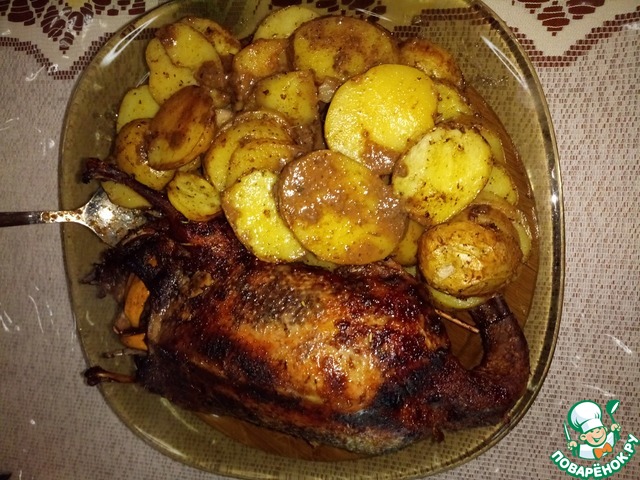За это время чистим картофель, нарезаем его колечками, солим и перчим - по вкусу (здесь лучше немного не досолить, так как утка будет давать сок, который уже подсоленный, а картошка будет его впитывать). Утку ставим на полчаса в духовку без картофеля (духовка разогрета до 200 градусов), чтобы уточка дала немного сока, а потом выкладываем картошечку.