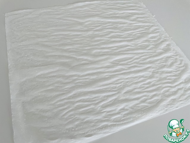 Ложкой придавливаем как можно тоньше, одновременно придаем форму квадрата. Минут через пять смесь будет теплой и ее можно подправить руками. У меня получилась толщина пол-пальца.