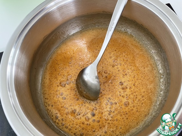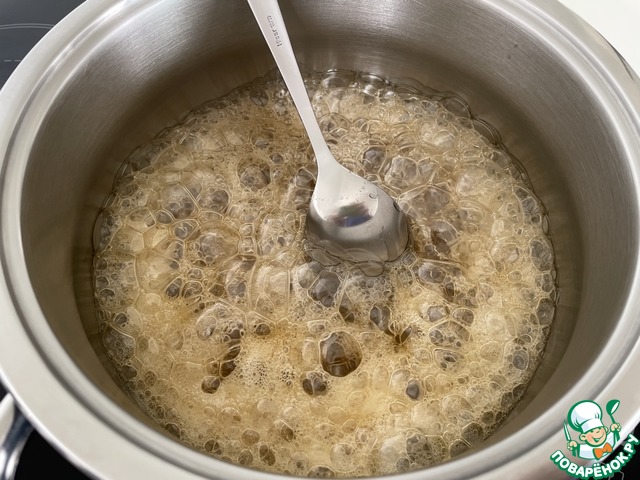 В кастрюлю (2 л) выкладываем 200 г меда и нагреваем его, постоянно помешивая. Как закипит, убавляем огонь на средний. Мед будет пениться, кастрюлю приподнимаем и опять опускаем, так 4 минуты.