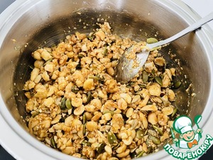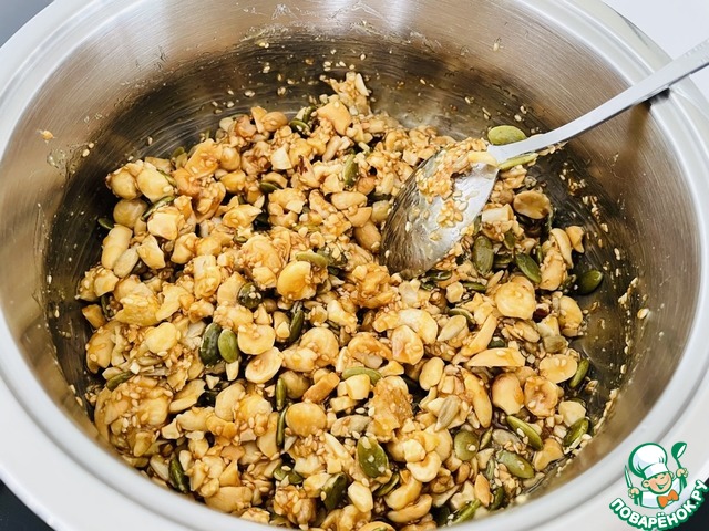 Добавляем орехово-семечковую смесь. Тщательно вымешиваем одну-две минуты.