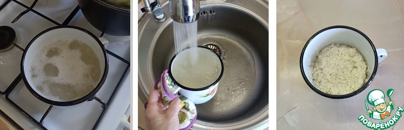 Рис отварить до полуготовности, затем промыть под проточной водой и дать воде стечь.