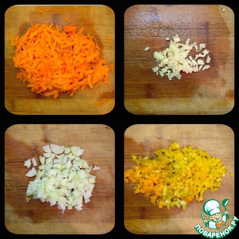 Почистить лук, морковь, перец и чеснок. 1 головку лука и перец нарезать кубиками, морковь натереть на крупной терке, чеснок мелко порубить.