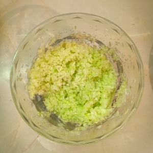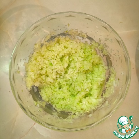 Вторую головку лука и срезанные прожилки перемолоть в блендере до мелкой кашицы.