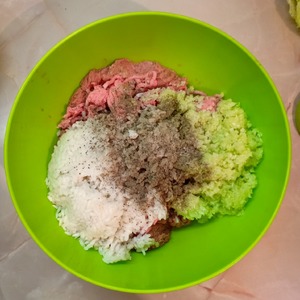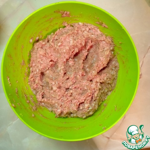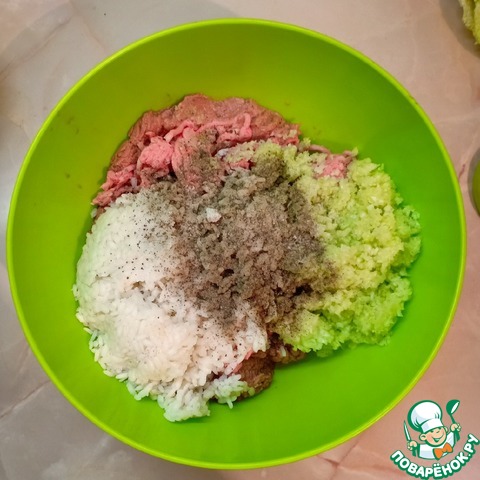 Смешать фарш, рис и капустно-луковую смесь, посолить и поперчить по вкусу.