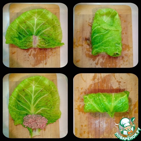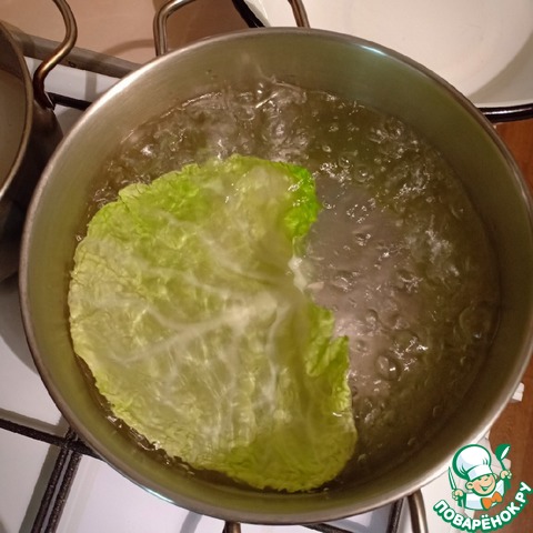 Капустные листья пробланшировать в кипящей воде 2 - 3мин, пока они не станут мягкими и пластичными, но не переварите. Остудить.