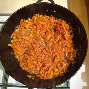На этой же сковороде обжарить нарезанный лук, перец, чеснок и морковь.