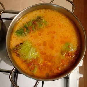 И залить водой так, чтобы она полностью покрывала содержимое. Вылить разведенную смесь из сметаны и соуса, осторожно перемешать, посолить и поперчить по вкусу, прикрыть крышкой и варить на медленном огне после закипания 30 - 40мин, за 5мин до готовности положить в кастрюлю лавровый лист.