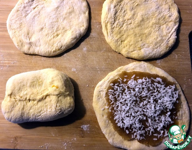 12. Около 1 чайной ложки начинки на булочку достаточно. Сверху посыпается 1-2 чайными ложками кокосовой стружки.
