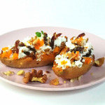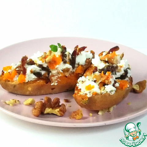 Интересная закуска из печенного батата с творожным сыром, финиками и орехами. Может быть вашей любимой она не станет, но запомнится точно благодаря сладковатому ореховому вкусу.